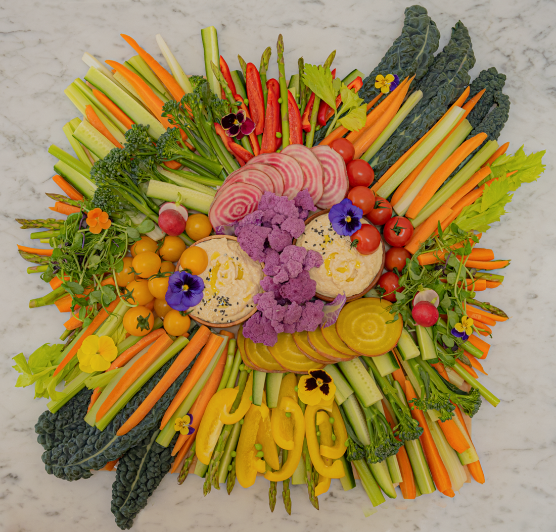 Perfect appetiser consisting of wide variety of sliced and whole raw and healthy vegetables with hummus dip to be enjoyed without a feeling of guilt.